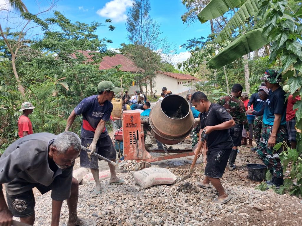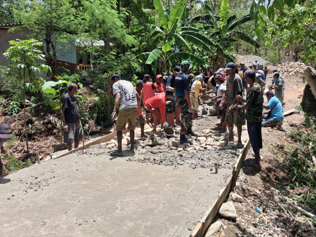 — Pemerintah Desa Banain B, Kecamatan Bikomi Utara, Kabupaten Timor Tengah Utara (TTU), menggandeng TNI dalam pengerjaan rabat jalan di wilayah dusun setempat.